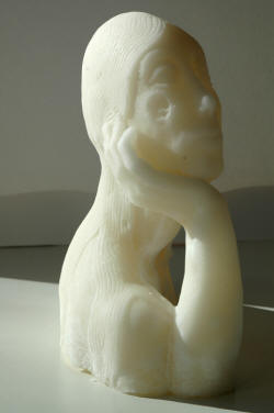 So sadly, the sugar experiments ended here, and Bitten Eve sits on a shelf in a downstairs room where the damp causes her slowly to decay, her beautiful form gradually slumping as though she has elephantiasis, and the smooth translucence of youth crystallizes to a chalky white surface blotched with discolourings of bacteria and mould.